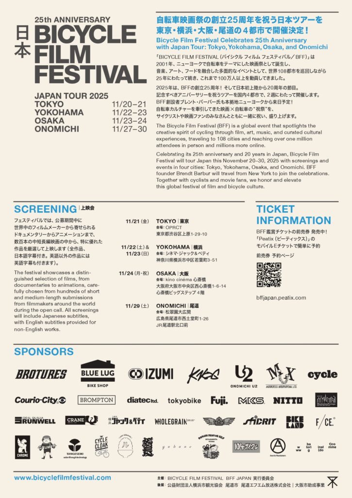 2025年は、BFFの創立25周年! そして日本初上陸から 20周年の節目。記念すべきアニバーサリーを祝うツアーを国内4都市で、2週にわたって開催予定。BFF創設者ブレント・ バーバー氏も本拠地ニューヨークから来日予定l 自転車カルチャーを牽引してきた映画×自転車の ‘’祝祭 ” を、 サイクリストや映画ファンのみなさんとともに一緒に祝い、盛り上げる!